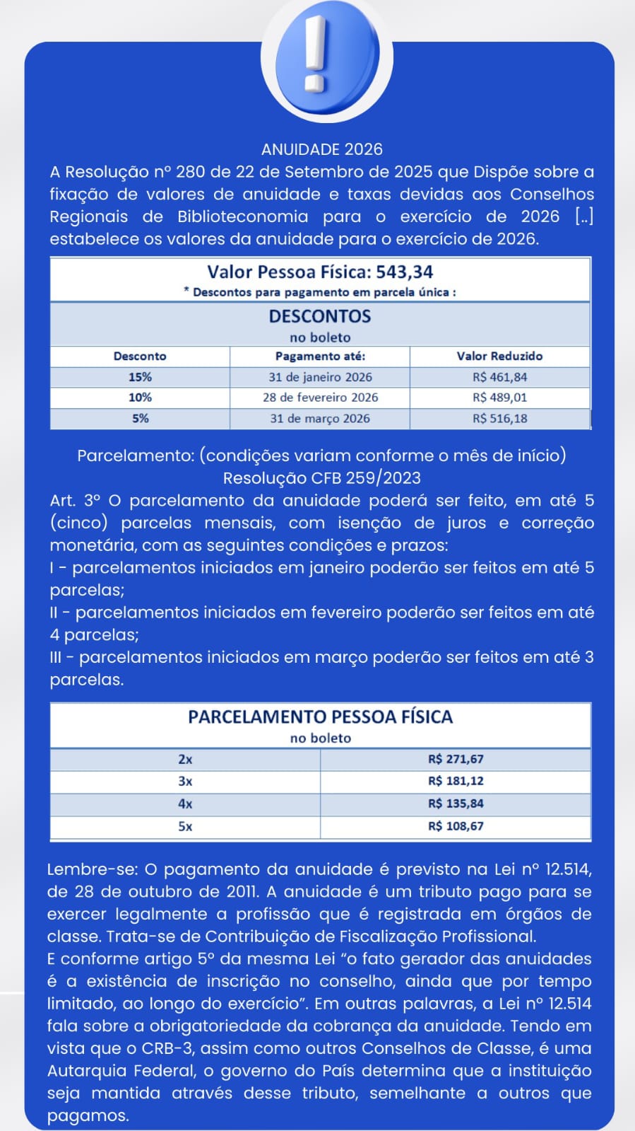 O Conselho Federal de Biblioteconomia-CFB institui, por meio da Resolução CFB nº 279/2025, a Campanha Nacional de Conciliação de Débitos para pessoas físicas e jurídicas registradas no Sistema CFB/CRB, com […]